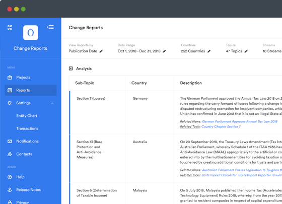 Orbitax Change Reports Tracker is a comprehensive solution for tracking worldwide tax law changes. With coverage of over 195 countries, and a broad range of features (including global footprint analysis, multiple user access, custom reports, push notifications and more), Orbitax CRT is a must-have tool to navigate the constantly changing landscape of international tax, enabling users to effectively plan for the years to come.